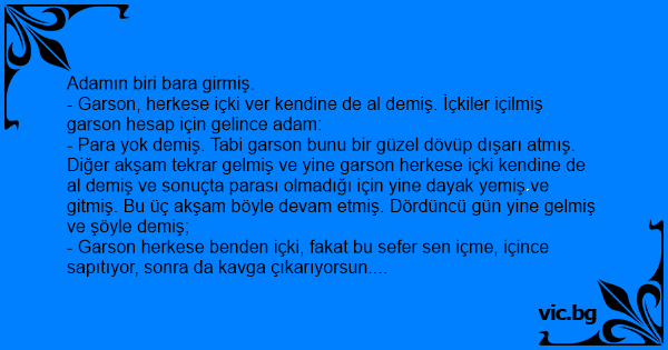 - Para yok demiş. Tabi garson bunu bir güzel dövüp dışarı atmış. Diğer akşam tekrar gelmiş ve yine garson herkese içki kendine de al demiş ve sonuçta parası olmadığı için yine dayak yemiş ve gitmiş. Bu üç akşam böyle devam etmiş. Dördüncü gün yine gelmiş ve şöyle demiş;