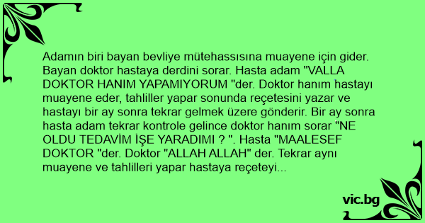 Adamın biri bayan bevliye mütehassısına muayene için gider. Bayan doktor hastaya derdini sorar. Hasta adam "VALLA DOKTOR HANIM YAPAMIYORUM "der. Doktor hanım hastayı muayene eder, tahliller yapar sonunda reçetesini yazar ve hastayı bir ay sonra tekrar gelmek üzere gönderir. Bir ay sonra hasta adam tekrar kontrole gelince doktor hanım sorar "NE OLDU TEDAVİM İŞE YARADIMI ? ". Hasta "MAALESEF DOKTOR "der. Doktor "ALLAH ALLAH" der. Tekrar aynı muayene ve tahlilleri yapar hastaya reçeteyi düzenleyip bir ay sonra gelmek üzere gönderir. Bir ay sonra hasta tekrar gelir, sonuç aynı. Doktor aynı işlemleri tekrarlar fakat sonuç değişmez. Doktor en son kontrole gelişinde artık yaptığı tedaviden sonuç alamamanın kızgınlığıyla hastaya "GEÇ ODAYA SOYUN "der. Hasta soyunur, doktorda soyunur, bir güzel işi bitirirler. Doktor sinirlenir ve "HANİ ULAN YAPAMIYORDUN" der. Hasta sırıtarak "BULUNCA YAPIYORUM DOKTOR" der.