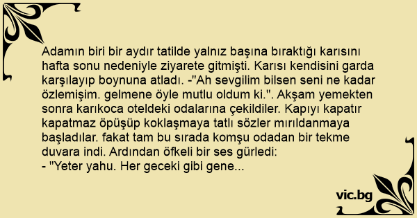 Adamın biri bir aydır tatilde yalnız başına bıraktığı karısını hafta sonu nedeniyle ziyarete gitmişti. Karısı kendisini garda karşılayıp boynuna atladı. -"Ah sevgilim bilsen seni ne kadar özlemişim. gelmene öyle mutlu oldum ki.". Akşam yemekten sonra karıkoca oteldeki odalarına çekildiler. Kapıyı kapatır kapatmaz öpüşüp koklaşmaya tatlı sözler mırıldanmaya başladılar. fakat tam bu sırada komşu odadan bir tekme duvara indi. Ardından öfkeli bir ses gürledi: