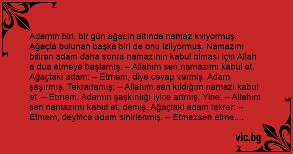 Adamın biri, bir gün ağacın altında namaz kılıyormuş. Ağaçta bulunan başka biri de onu izliyormuş. Namazını bitiren adam daha sonra namazının kabul olması için Allah a dua etmeye başlamış. – Allahım sen namazımı kabul et. Ağaçtaki adam: – Etmem, diye cevap vermiş. Adam şaşırmış. Tekrarlamış: – Allahım sen kıldığım namazı kabul et. – Etmem. Adamın şaşkınlığı iyice artmış. Yine: – Allahım sen namazımı kabul et, demiş. Ağaçtaki adam tekrar: – Etmem, deyince adam sinirlenmiş. – Etmezsen etme. Zaten abdestsiz kılmıştım.