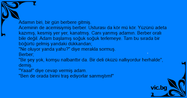 Aceminin de acemisiymiş berber. Usturası da kör mü kör. Yüzünü adeta kazımış, kesmiş yer yer, kanatmış. Canı yanmış adamın. Berber oralı bile değil. Adam başlamış soğuk soğuk terlemeye. Tam bu sırada bir böğürtü gelmiş yandaki dükkandan;