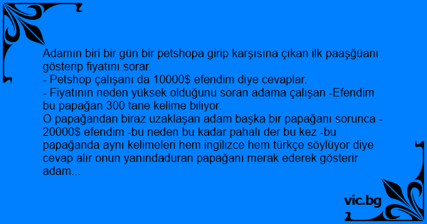 O papağandan biraz uzaklaşan adam başka bir papağanı sorunca -20000$ efendim -bu neden bu kadar pahalı der bu kez -bu papağanda aynı kelimeleri hem ingilizce hem türkçe söylüyor diye cevap alır onun yanındaduran papağanı merak ederek gösterir adam -bunun fiyatı nedir -30000$ efendim buda kelimeleri her dilde söylüyor Şaşkın adam dükkanın en sonunda duran papağana yönelir ve onun fiyatını sorar -bunun fiyatı nedir -100000$ efendim -peki bunun özelliği nedir diyince -valla bu pek konuşmuyo ama ordaki 3 papağan buna “hocam” diyorlar.