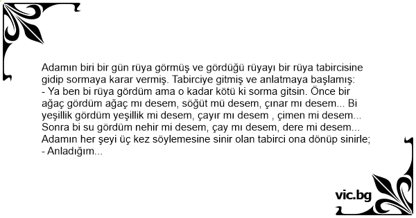 Adamın biri bir gün rüya görmüş ve gördüğü rüyayı bir rüya tabircisine gidip sormaya karar vermiş. Tabirciye gitmiş ve anlatmaya başlamış: