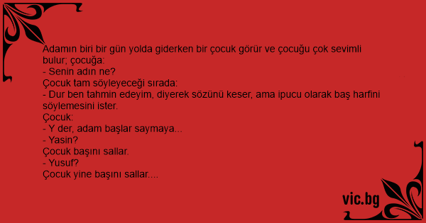 Adam y harfi ile başlayan tüm isimleri sayar, çocuk her seferinde başını sallar. Adam iyice sinirlenir ve kız isimleri de saymaya başlar; çocuk yine başını sallar. Adam en sonunda: