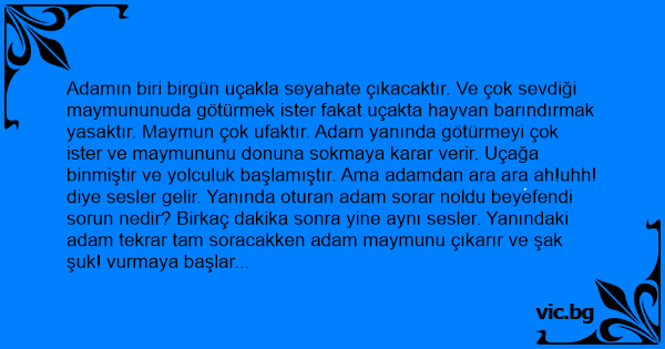 Adamın biri birgün uçakla seyahate çıkacaktır. Ve çok sevdiği maymununuda götürmek ister fakat uçakta hayvan barındırmak yasaktır. Maymun çok ufaktır. Adam yanında götürmeyi çok ister ve maymununu donuna sokmaya karar verir. Uçağa binmiştir ve yolculuk başlamıştır. Ama adamdan ara ara ah!uhh! diye sesler gelir. Yanında oturan adam sorar noldu beyefendi sorun nedir? Birkaç dakika sonra yine aynı sesler. Yanındaki adam tekrar tam soracakken adam maymunu çıkarır ve şak şuk! vurmaya başlar maymuna. Yanındaki adam;ya iyi hoş hadi maymunu sokmuşsun şimdi niye dövüyosun der. Adam da:Ya sorma bu eşşolueşşek bizim ya... Ğı ağaç zannedip indi çıktı indi çıktı. Diğer adam ee.. der. Sonra g... Mü mağara zannetti girdi çıktı girdi çıktı der. T... Akları ceviz zannedip kaldırdı vurdu kaldırdı vurdu der. Yanındaki adam gülerek e.. der Adam dayanamaz patlar bütün bunlar yetmiyomuş gibi bizim cevizleri mağaraya sokmaya çalışmaz mı? der.