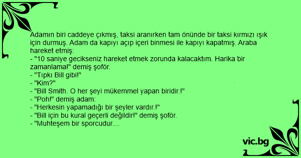 Adamın biri caddeye çıkmış, taksi aranırken tam önünde bir taksi kırmızı ışık için durmuş. Adam da kapıyı açıp içeri binmesi ile kapıyı kapatmış. Araba hareket etmiş:
