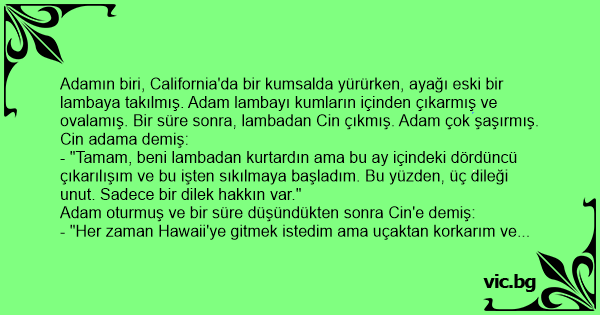Adamın biri, California'da bir kumsalda yürürken, ayağı eski bir lambaya takılmış. Adam lambayı kumların içinden çıkarmış ve ovalamış. Bir süre sonra, lambadan Cin çıkmış. Adam çok şaşırmış.