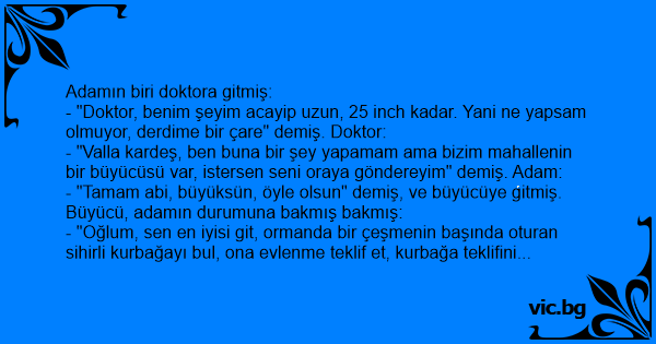 - "Valla kardeş, ben buna bir şey yapamam ama bizim mahallenin bir büyücüsü var, istersen seni oraya göndereyim" demiş. Adam: