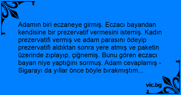 Adamın biri eczaneye girmiş. Eczacı bayandan kendisine bir prezervatif vermesini istemiş. Kadın prezervatifi vermiş ve adam parasını ödeyip prezervatifi aldıktan sonra yere atmış ve paketin üzerinde zıplayıp, çiğnemiş. Bunu gören eczacı bayan niye yaptığını sormuş. Adam cevaplamış -Sigarayı da yıllar önce böyle bırakmıştım...
