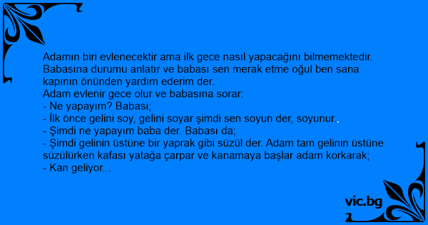 Adamın biri evlenecektir ama ilk gece nasıl yapacağını bilmemektedir. Babasına durumu anlatır ve babası sen merak etme oğul ben sana kapının önünden yardım ederim der.