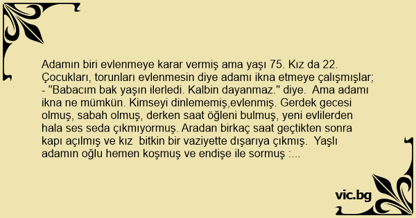 - "Babacım bak yaşın ilerledi. Kalbin dayanmaz." diye. Ama adamı ikna ne mümkün. Kimseyi dinlememiş,evlenmiş. Gerdek gecesi olmuş, sabah olmuş, derken saat öğleni bulmuş, yeni evlilerden hala ses seda çıkmıyormuş. Aradan birkaç saat geçtikten sonra kapı açılmış ve kız bitkin bir vaziyette dışarıya çıkmış. Yaşlı adamın oğlu hemen koşmuş ve endişe ile sormuş :