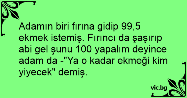 Adamın biri fırına gidip 99,5 ekmek istemiş. Fırıncı da şaşırıp abi gel şunu 100 yapalım deyince adam da -"Ya o kadar ekmeği kim yiyecek" demiş.