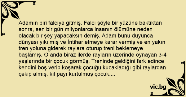 Adamın biri falcıya gitmiş. Falcı şöyle bir yüzüne baktıktan sonra, sen bir gün milyonlarca insanın ölümüne neden olacak bir şey yapacaksın demiş. Adam bunu duyunca dünyası yıkılmış ve İntihar etmeye karar vermiş ve en yakın tren yoluna giderek raylara oturup treni beklemeye başlamış. O anda biraz ilerde rayların üzerinde oynayan 3-4 yaşlarında bir çocuk görmüş. Treninde geldiğini fark edince kendini boş verip koşarak çocuğu kucakladığı gibi raylardan çekip almış, kıl payı kurtulmuş çocuk. Adam sormuş: Oğlum burada oynamak çok tehlikeli, nerde oturuyorsun sen? Çocuk: Şurada ilerde amca demiş. Adam: Adın ne senin oğlum? "Adolf "amca...