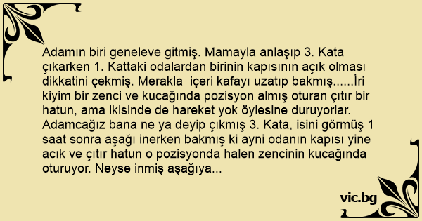 Adamın biri geneleve gitmiş. Mamayla anlaşıp 3. Kata çıkarken 1. Kattaki odalardan birinin kapısının açık olması dikkatini çekmiş. Merakla içeri kafayı uzatıp bakmış.....,İri kiyim bir zenci ve kucağında pozisyon almış oturan çıtır bir hatun, ama ikisinde de hareket yok öylesine duruyorlar. Adamcağız bana ne ya deyip çıkmış 3. Kata, isini görmüş 1 saat sonra aşağı inerken bakmış ki ayni odanın kapısı yine acık ve çıtır hatun o pozisyonda halen zencinin kucağında oturuyor. Neyse inmiş aşağıya ödemeyi yapmış, ama akli yukarda ve dayanamayıp mamaya "Özür dilerim bir şey sorabilir miyim?" demiş Mama da "Tabii buyurun sorun" demiş. Adam "1. Kattaki zenci ve kucağındaki kız 1 saattir ayni pozisyonda hareketsizce duruyorlar, neden acaba?" Mama: