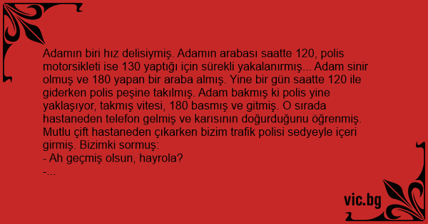 Adamın biri hız delisiymiş. Adamın arabası saatte 120, polis motorsikleti ise 130 yaptığı için sürekli yakalanırmış... Adam sinir olmuş ve 180 yapan bir araba almış. Yine bir gün saatte 120 ile giderken polis peşine takılmış. Adam bakmış ki polis yine yaklaşıyor, takmış vitesi, 180 basmış ve gitmiş. O sırada hastaneden telefon gelmiş ve karısının doğurduğunu öğrenmiş. Mutlu çift hastaneden çıkarken bizim trafik polisi sedyeyle içeri girmiş. Bizimki sormuş: