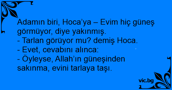 Adamın biri, Hoca’ya – Evim hiç güneş görmüyor, diye yakınmış.<br />- Tarlan görüyor mu? demiş Hoca.<br />- Evet, cevabını alınca:<br />- Öyleyse, Allah’ın güneşinden sakınma, evini tarlaya taşı.
