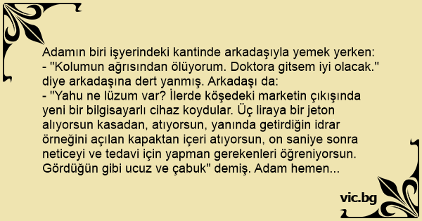 - "Yahu ne lüzum var? İlerde köşedeki marketin çıkışında yeni bir bilgisayarlı cihaz koydular. Üç liraya bir jeton alıyorsun kasadan, atıyorsun, yanında getirdiğin idrar örneğini açılan kapaktan içeri atıyorsun, on saniye sonra neticeyi ve tedavi için yapman gerekenleri öğreniyorsun. Gördüğün gibi ucuz ve çabuk" demiş. Adam hemen bir kaba idrarını doldurup arkadaşının dediğini yapmış ve Bilgisayar hemen yazılı olarak cevap vermiş: