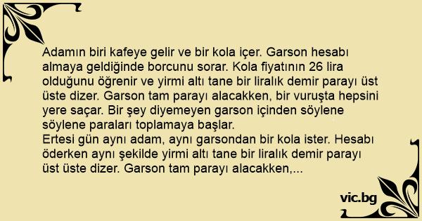 Adamın biri kafeye gelir ve bir kola içer. Garson hesabı almaya geldiğinde borcunu sorar. Kola fiyatının 26 lira olduğunu öğrenir ve yirmi altı tane bir liralık demir parayı üst üste dizer. Garson tam parayı alacakken, bir vuruşta hepsini yere saçar. Bir şey diyemeyen garson içinden söylene söylene paraları toplamaya başlar.