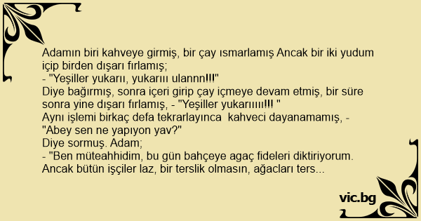 Diye bağırmış, sonra içeri girip çay içmeye devam etmiş, bir süre sonra yine dışarı fırlamış, - "Yeşiller yukarııııı!!! "
