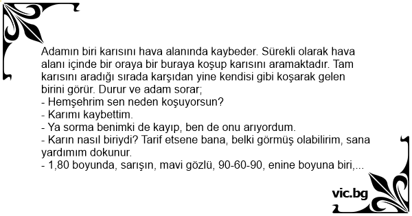 Adamın biri karısını hava alanında kaybeder. Sürekli olarak hava alanı içinde bir oraya bir buraya koşup karısını aramaktadır. Tam karısını aradığı sırada karşıdan yine kendisi gibi koşarak gelen birini görür. Durur ve adam sorar;