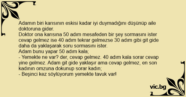 - Yemekte ne var? der, cevap gelmez. 40 adım kala sorar cevap yine gelmez. Adam giт gide yaklaşır ama cevap gelmez, en son kadının omzuna dokunup sorar kadın;