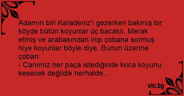 Adamın biri Karadeniz'i gezerken bakmış bir köyde bütün koyunlar üç bacaklı. Merak etmiş ve arabasından inip çobana sormuş niye koyunlar böyle diye. Bunun üzerine çoban: