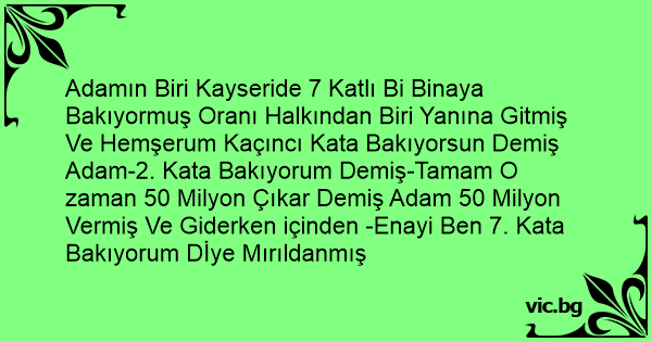 Adamın Biri Kayseride 7 Katlı Bi Binaya Bakıyormuş Oranı Halkından Biri Yanına Gitmiş Ve Hemşerum Kaçıncı Kata Bakıyorsun Demiş Adam-2. Kata Bakıyorum Demiş-Tamam O zaman 50 Milyon Çıkar Demiş Adam 50 Milyon Vermiş Ve Giderken içinden -Enayi Ben 7. Kata Bakıyorum Dİye Mırıldanmış
