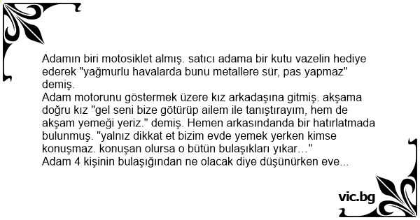 Adamın biri motosiklet almış. satıcı adama bir kutu vazelin hediye ederek "yağmurlu havalarda bunu metallere sür, pas yapmaz" demiş.