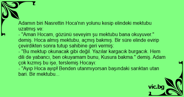 - "Aman Hocam, gözünü seveyim şu mektubu bana okuyuver." demiş. Hoca almış mektubu, açmış bakmış. Bir süre elinde evirip çevirdikten sonra tutup sahibine geri vermiş: