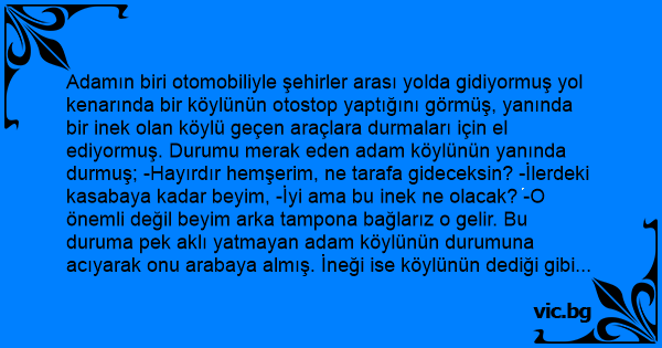 Adamın biri otomobiliyle şehirler arası yolda gidiyormuş yol kenarında bir köylünün otostop yaptığını görmüş, yanında bir inek olan köylü geçen araçlara durmaları için el ediyormuş. Durumu merak eden adam köylünün yanında durmuş; -Hayırdır hemşerim, ne tarafa gideceksin? -İlerdeki kasabaya kadar beyim, -İyi ama bu inek ne olacak? -O önemli değil beyim arka tampona bağlarız o gelir. Bu duruma pek aklı yatmayan adam köylünün durumuna acıyarak onu arabaya almış. İneği ise köylünün dediği gibi arka tampona bağlamışlar. Araba yavaş yavaş ilerlemiş. Adamın hızlanmaya çekindiğini anlayan köylü; -Sen yürü beyim o gelir. demiş Bunun üzerine adam hızlanmaya başlamış. 20,30,40 bakmış inek gerçekten geliyor. Adam şaşırmış, 50, 60, 70 bakmış hala geliyor ve inekde hiçbir yorgunluk belirtisi yok. Artık şaşkınlığı iyice artmış ve sinirlenmeye de başlamış. Öyle ya sonuçta bir inek ne kadar hızlı koşabilir ki. Derken adam iyice hızlanmış. Kilometre 120 yi gösteriyor. Dikiz aynasyndan ineğe bir bakmış ve gülümseyerek köylüye dönüp; -Senin inek yoruldu herhalde baksana dili dışarda. -Ne tarafa çıkarmış dilini. Buna dikkat etmeyen adam tekrar bakar ve sol tarafa der. Bunun üzerine köylü kendinden emin bir tavırla; -O yorgunluktan değil, seni sollayacak da sinyal veriyor...