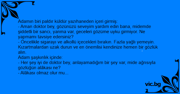 - Her şey iyi de doktor bey, anlayamadığım bir şey var, mide ağrısıyla gözlüğün alâkası ne?