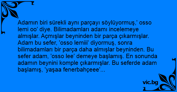Adamın biri sürekli aynı parçayı söylüyormuş,' osso lemi oo' diye. Bilimadamları adamı incelemeye almışlar. Açmışlar beyninden bir parça çıkarmışlar. Adam bu sefer, 'osso lemiii' diyormuş, sonra bilimadamları bir parça daha almışlar beyninden. Bu sefer adam, 'osso lee' demeye başlamış. En sonunda adamın beynini komple çıkarmışlar. Bu seferde adam başlamış, 'yaşaa fenerbahçeee'...