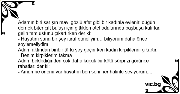 Adamın biri sarışın mavi gözlü afet gibi bir kadınla evlenir. düğün dernek biter çift balayı için gittikleri otel odalarında başbaşa kalırlar. gelin tam üstünü çıkartırken der ki: