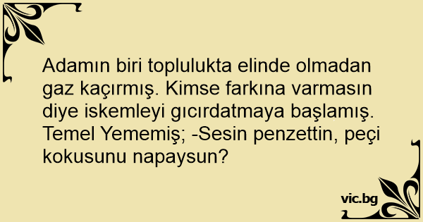 Adamın biri toplulukta elinde olmadan gaz kaçırmış. Kimse farkına varmasın diye iskemleyi gıcırdatmaya başlamış.