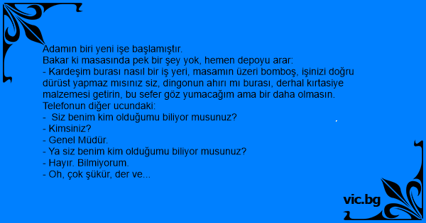 - Kardeşim burası nasıl bir iş yeri, masamın üzeri bomboş, işinizi doğru dürüst yapmaz mısınız siz, dingonun ahırı mı burası, derhal kırtasiye malzemesi getirin, bu sefer göz yumacağım ama bir daha olmasın.