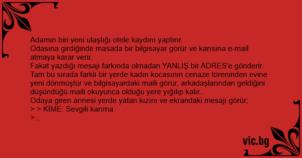 Tam bu sırada farklı bir yerde kadın kocasının cenaze töreninden evine yeni dönmüştür ve bilgisayardaki maili görür, arkadaşlarından geldiğini düşündüğü maili okuyunca olduğu yere yığılıp kalır..