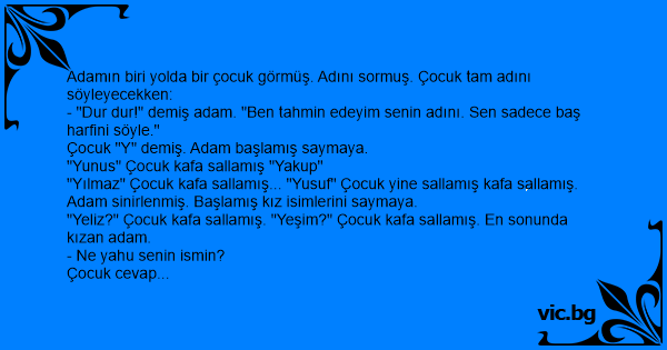 "Yılmaz" Çocuk kafa sallamış... "Yusuf" Çocuk yine sallamış kafa sallamış. Adam sinirlenmiş. Başlamış kız isimlerini saymaya.