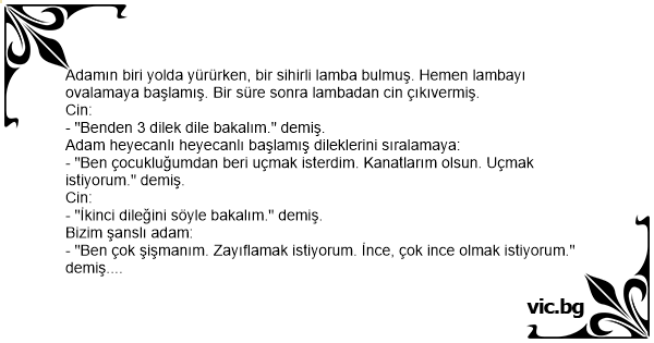 Adamın biri yolda yürürken, bir sihirli lamba bulmuş. Hemen lambayı ovalamaya başlamış. Bir süre sonra lambadan cin çıkıvermiş.