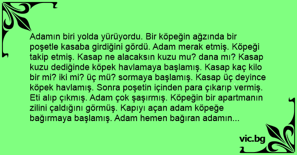Adamın biri yolda yürüyordu. Bir köpeğin ağzında bir poşetle kasaba girdiğini gördü. Adam merak etmiş. Köpeği takip etmiş. Kasap ne alacaksın kuzu mu? dana mı? Kasap kuzu dediğinde köpek havlamaya başlamış. Kasap kaç kilo bir mi? iki mi? üç mü? sormaya başlamış. Kasap üç deyince köpek havlamış. Sonra poşetin içinden para çıkarıp vermiş. Eti alıp çıkmış. Adam çok şaşırmış. Köpeğin bir apartmanın zilini çaldığını görmüş. Kapıyı açan adam köpeğe bağırmaya başlamış. Adam hemen bağıran adamın yanına giderek: