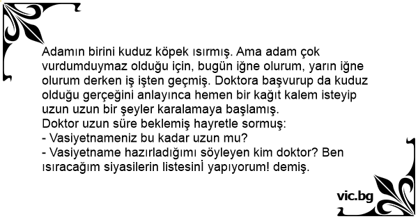 Adamın birini kuduz köpek ısırmış. Ama adam çok vurdumduymaz olduğu için, bugün iğne olurum, yarın iğne olurum derken iş işten geçmiş. Doktora başvurup da kuduz olduğu gerçeğini anlayınca hemen bir kağıt kalem isteyip uzun uzun bir şeyler karalamaya başlamış.