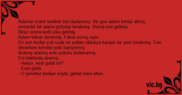 Adamın evine kedinin biri dadanmış. Bir gün adam kediyi almış, ormanlık bir alana götürüp bırakmış. Sonra eve gelmiş.