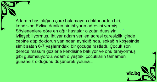 - “Doktorlar benim hasta olduğumu söylediler. İyileşmem için bana dua eder misin?” Çocuk bu teklif karşısında şaşırmışa benziyordu. Kafasını olur der gibi sallarken:
