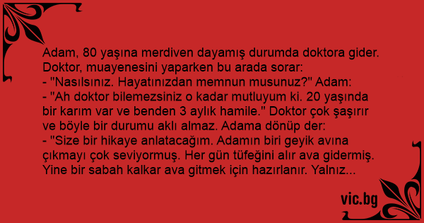 - "Ah doktor bilemezsiniz o kadar mutluyum ki. 20 yaşında bir karım var ve benden 3 aylık hamile." Doktor çok şaşırır ve böyle bir durumu aklı almaz. Adama dönüp der: