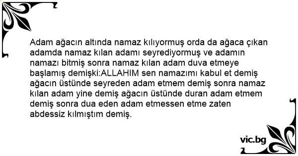 Adam ağacın altında namaz kılıyormuş orda da ağaca çıkan adamda namaz kılan adamı seyrediyormuş ve adamın namazı bitmiş sonra namaz kılan adam duva etmeye başlamış demişki:ALLAHIM sen namazımı kabul et demiş ağacın üstünde seyreden adam etmem demiş sonra namaz kılan adam yine demiş ağacın üstünde duran adam etmem demiş sonra dua eden adam etmessen etme zaten abdessiz kılmıştım demiş.