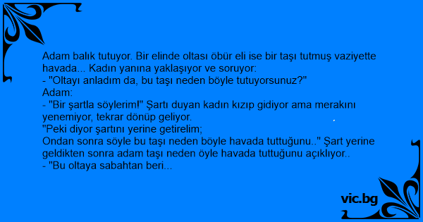 Adam balık tutuyor. Bir elinde oltası öbür eli ise bir taşı tutmuş vaziyette havada... Kadın yanına yaklaşıyor ve soruyor: