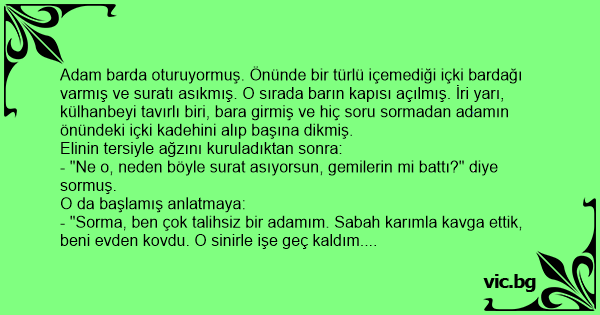 Adam barda oturuyormuş. Önünde bir türlü içemediği içki bardağı varmış ve suratı asıkmış. O sırada barın kapısı açılmış. İri yarı, külhanbeyi tavırlı biri, bara girmiş ve hiç soru sormadan adamın önündeki içki kadehini alıp başına dikmiş.