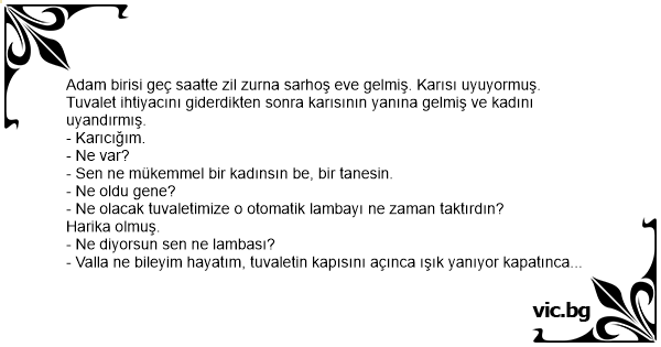 Adam birisi geç saatte zil zurna sarhoş eve gelmiş. Karısı uyuyormuş. Tuvalet ihtiyacını giderdikten sonra karısının yanına gelmiş ve kadını uyandırmış.
