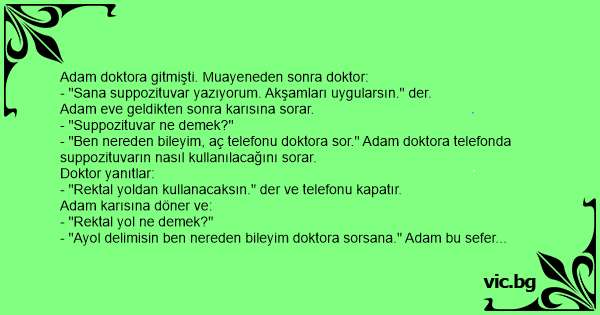 - "Ben nereden bileyim, aç telefonu doktora sor." Adam doktora telefonda suppozituvarın nasıl kullanılacağını sorar.