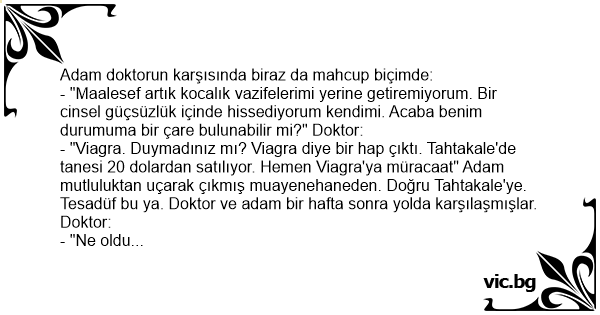 - "Viаgrа. Duymadınız mı? Viаgrа diye bir hap çıktı. Tahtakale'de tanesi 20 dolardan satılıyor. Hemen Viаgrа'ya müracaat" Adam mutluluktan uçarak çıkmış muayenehaneden. Doğru Tahtakale'ye. Tesadüf bu ya. Doktor ve adam bir hafta sonra yolda karşılaşmışlar. Doktor: