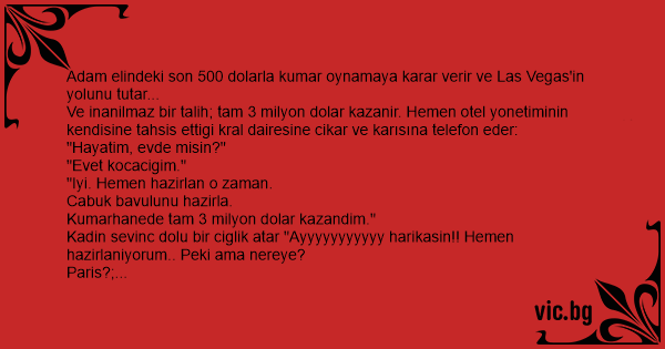 Ve inanilmaz bir talih; tam 3 milyon dolar kazanir. Hemen otel yonetiminin kendisine tahsis ettigi kral dairesine cikar ve karısına telefon eder: